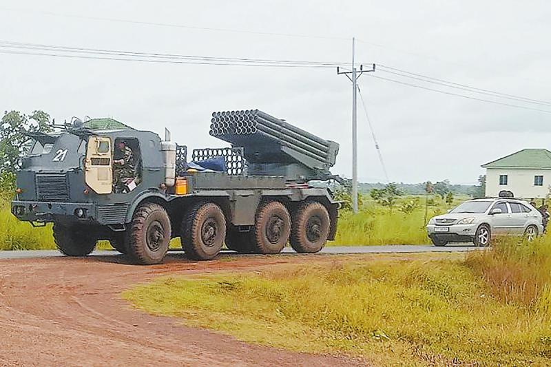 7月24日,一辆柬埔寨BM-21火箭炮发射车从柏威夏省柬泰边境返回。新华社/法新