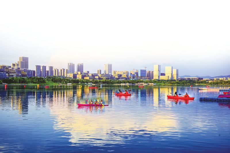 7月22日,成都世运会水上项目比赛场地兴隆湖,人们在湖上体验皮划艇,欣赏公园城市美景。 张治平 摄(C视觉)