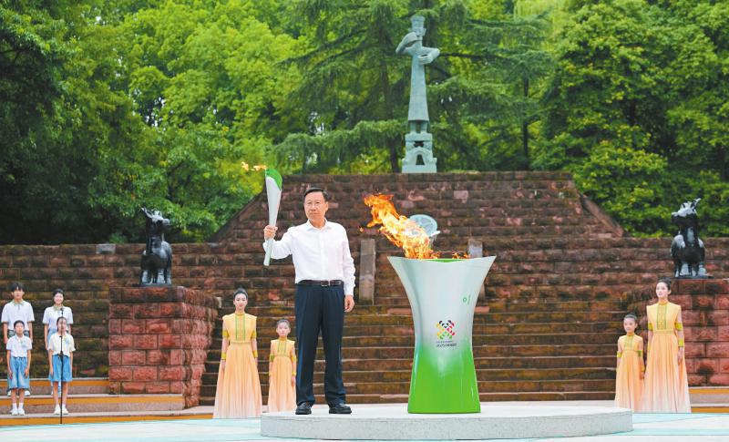 省委书记、省人大常委会主任王晓晖点燃成都世运会火炬并宣布火炬传递开始。7月26日,2025年第12届世界运动会火种采集暨火炬传递启动仪式在三星堆博物馆祭祀台广场举行。 四川日报全媒体记者 欧阳杰 摄