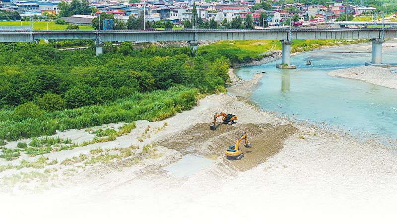 什邡市马井镇马井大桥下,工程队正对被水毁堤坝进行临时加固处置。 四川日报全媒体记者 黄潇 摄