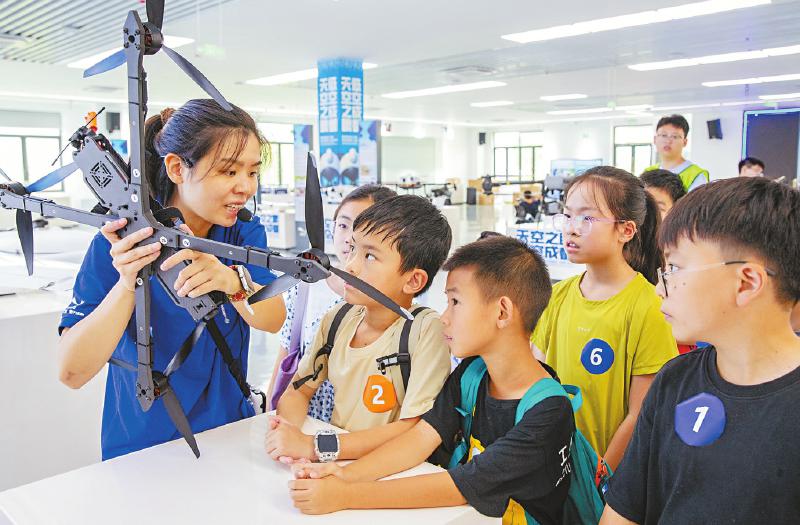 7月24日,在位于成都彭州市的国家级民用无人驾驶航空试验基地,教练向孩子们讲解民用无人机知识。 罗国杨 摄(C视觉)