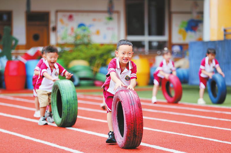 7月24日,在乐山市惠灵幼儿园,小朋友在参加滚轮胎比赛。李华时 摄(C视觉)