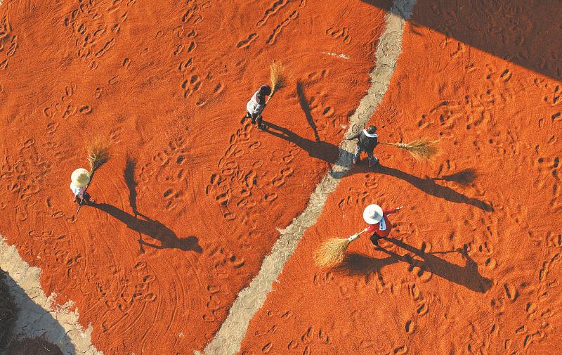 7月26日,泸州市江阳区黄舣镇永兴村村民在晾晒高粱。盛夏时节,江阳区种植的高粱进入收获季。刘学懿 摄(C视觉)