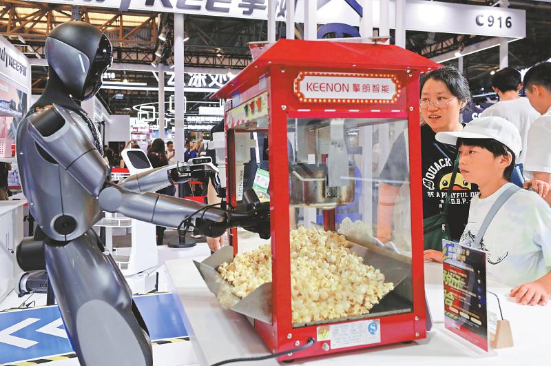 参观者在一个机器人爆米花摊位前驻足观看。新华社记者 方喆 摄