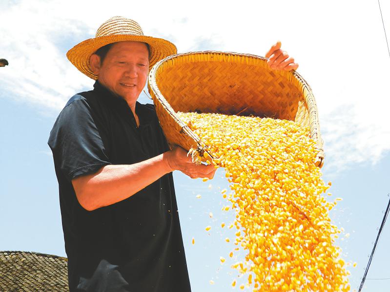 7月28日,在达州市达川区管村镇村坪村,村民趁着晴好天气晾晒刚收获的玉米。目前,达州市种植的206.7万亩优质黄金玉米喜迎丰收,农民抢抓农时收获、搬运、晾晒,确保颗粒归仓。 邓良奎 摄(C视觉)