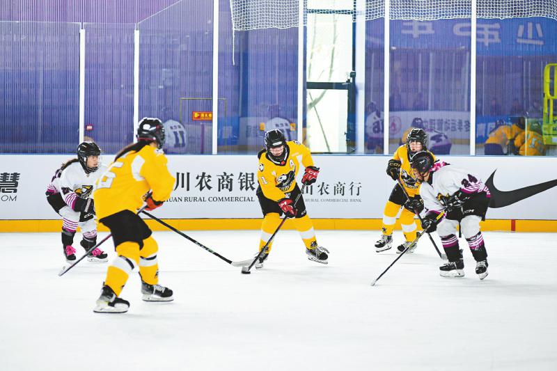 四川省U16女子冰球队(黄色队服)4∶1击败四川体育职业学院队。