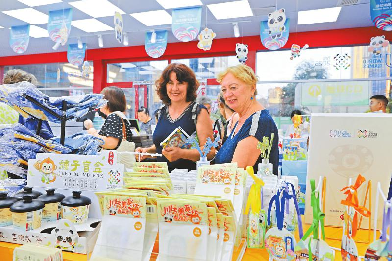 7月28日,成都市红星路上的世运会官方特许商品零售店里热闹非凡,中外游客在此选购纪念品。 李天祥 摄(C视觉)