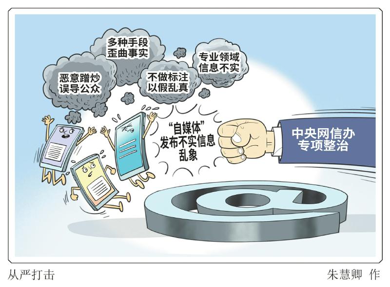 为进一步规范“自媒体”信息发布行为,按照2025年“清朗”系列专项行动总体安排,中央网信办决定在全国范围内启动为期2个月的“清朗·整治‘自媒体’发布不实信息”专项行动,从严打击恶意蹭炒误导公众、多种手段歪曲事实、不做标注以假乱真、专业领域信息不实等4类突出问题。 朱慧卿 图