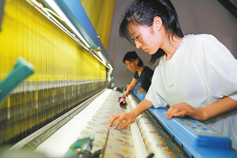 在位于成都古蜀蜀锦研究所的蜀锦工坊新车间内,工作人员正在织锦。