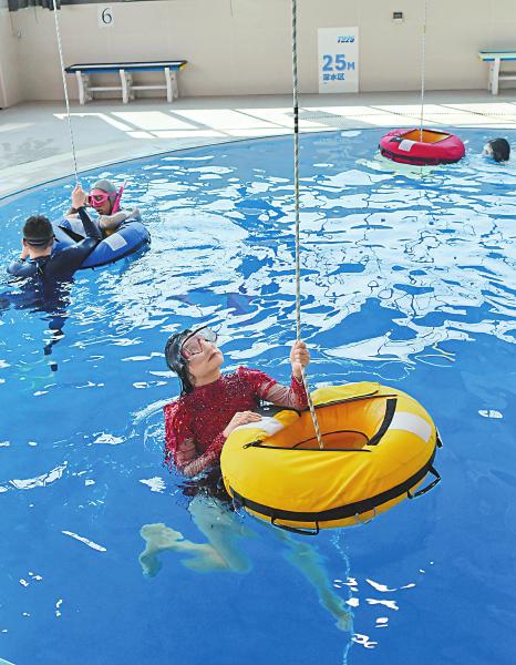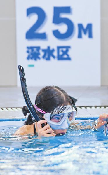 7月26日,在成都一家潜水俱乐部浅水区练习潜水的学员大多是女性。