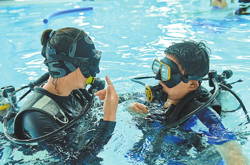 8月1日,水肺潜水学员在教练(左)的指导下练习潜水动作。