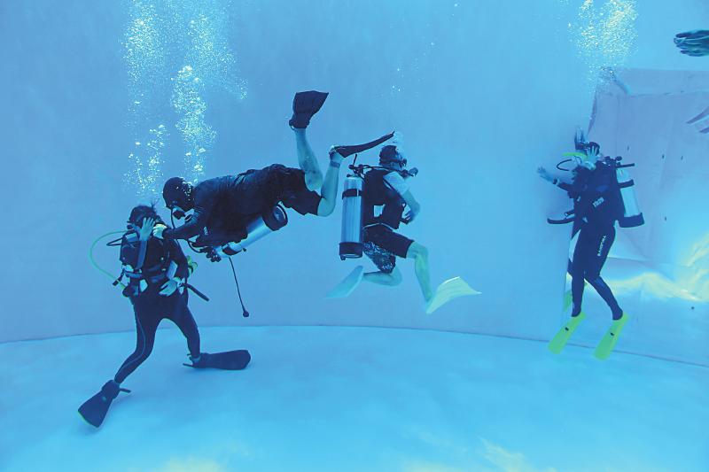 8月2日,水肺潜水学员在教练的指导下在25米深的潜水馆中练习潜水。