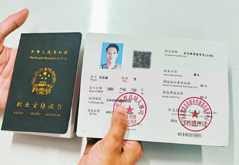 8月1日,潜水教练苏灿潮向记者展示他的潜水教练证件。