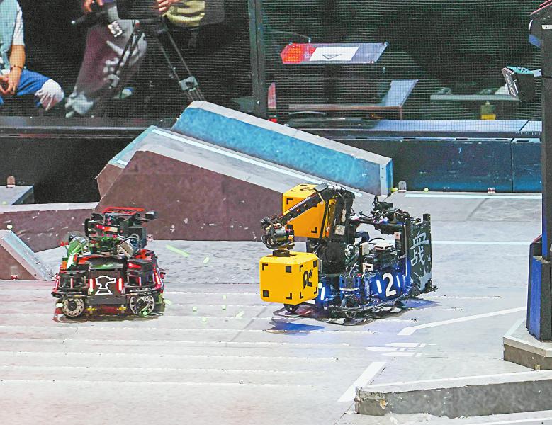 8月3日,第二十四届全国大学生机器人大赛——RoboMaster 2025机甲大师超级对抗赛·全国赛(RMUC 2025)在深圳收官。上海交通大学交龙战队获得全国总冠军。图为上海交通大学交龙战队的机器人(左)和中国科学技术大学的机器人在决赛中。新华社记者 毛思倩 摄