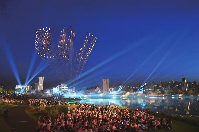 8月7日,成都世运会开幕式中心舞台南、北两侧为市民开放观演区。观众坐在露营椅上,近看舞台,远眺城市天际线、湖面和绿地。