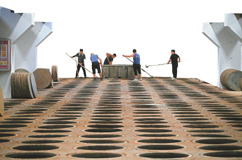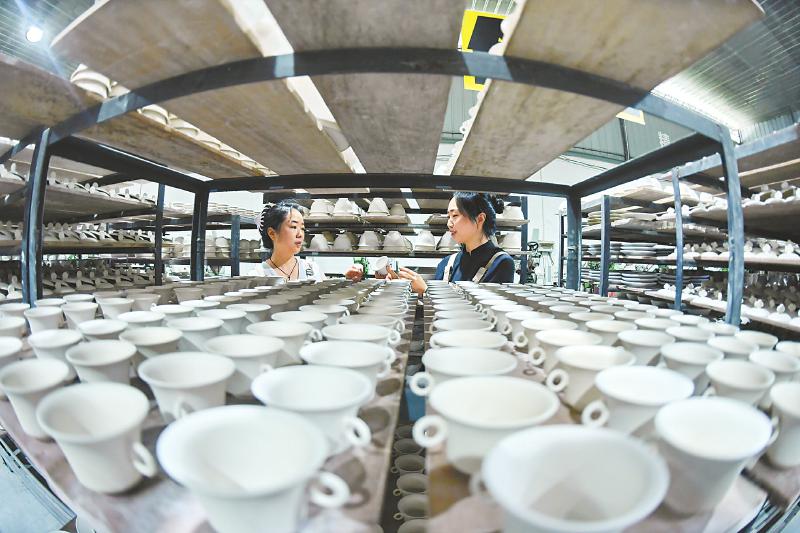 8月11日,在彭州市白瓷艺术中心制作工坊,工作人员检查泥坯是否变形。