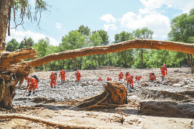 8月11日,武警甘肃总队机动支队官兵在兰州市榆中县马莲滩村搜寻失联人员。 新华社发(侯崇慧 摄)