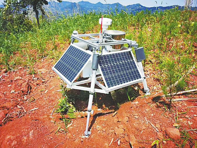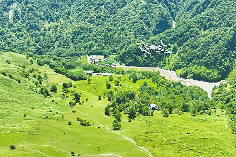 无人机正在宝兴山区部署“雨神-1号”雨量站。成都高新减灾研究所供图