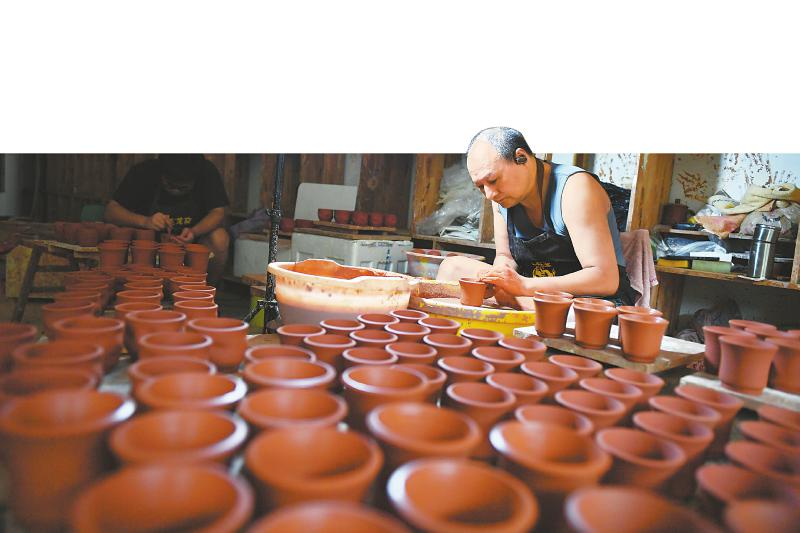 8月11日,在彭州市桂花镇桂花龙窑,陶艺工人在制作陶器。