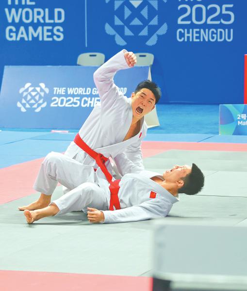 李雨财(上)/郭奥在郭奥在赛后庆祝。 四川日报全媒体记者 向宇 摄