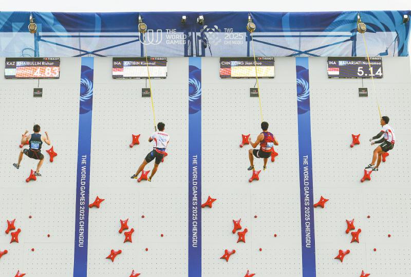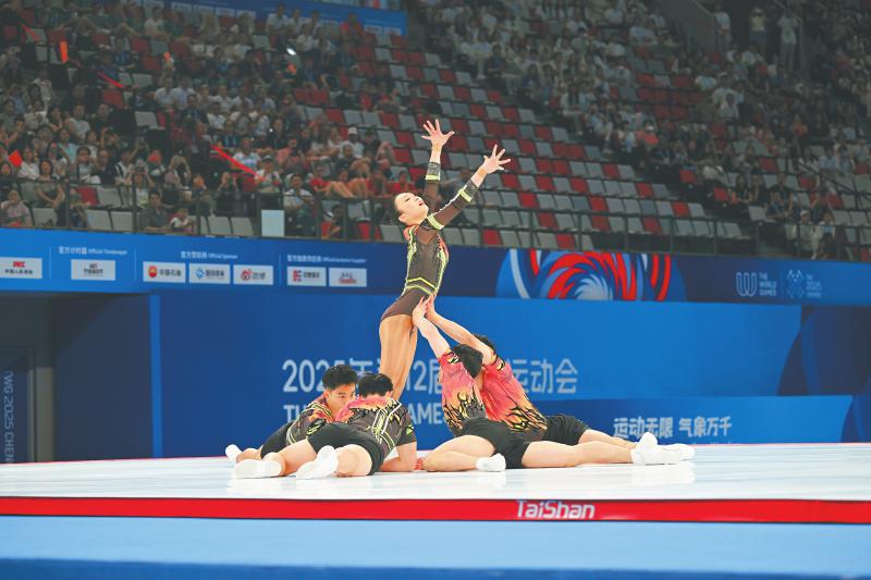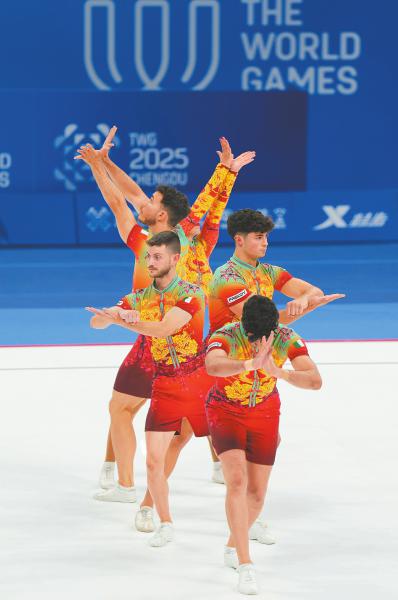 8月15日,在成都世运会健美操五人操决赛中,由5名“00后”选手范思伟、冯蕾、梁文杰、滕浩、许彤组成的中国队表现出非凡的激情和气势,动作兼顾高难度和艺术性,以20.265分夺冠。据介绍,这套动作表现了消防员救火的场景。四川日报全媒体记者 何海洋 摄
