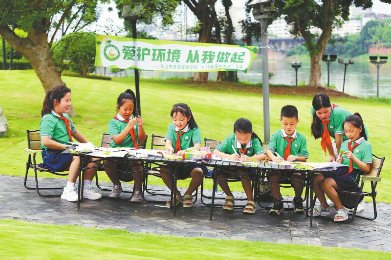 在第三个全国生态日到来之际,乐山市翡翠实验学校开展了“爱护环境 从我做起”活动。图为8月14日,翡翠实验学校学生在制作环保创意手工画。 李华时 摄(C视觉)