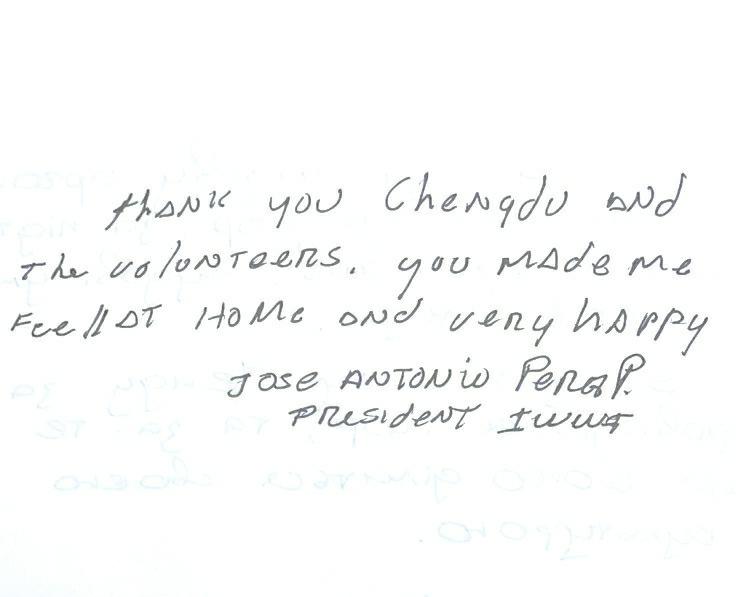 国际滑水联合会主席何塞·普列格写下的感谢信。