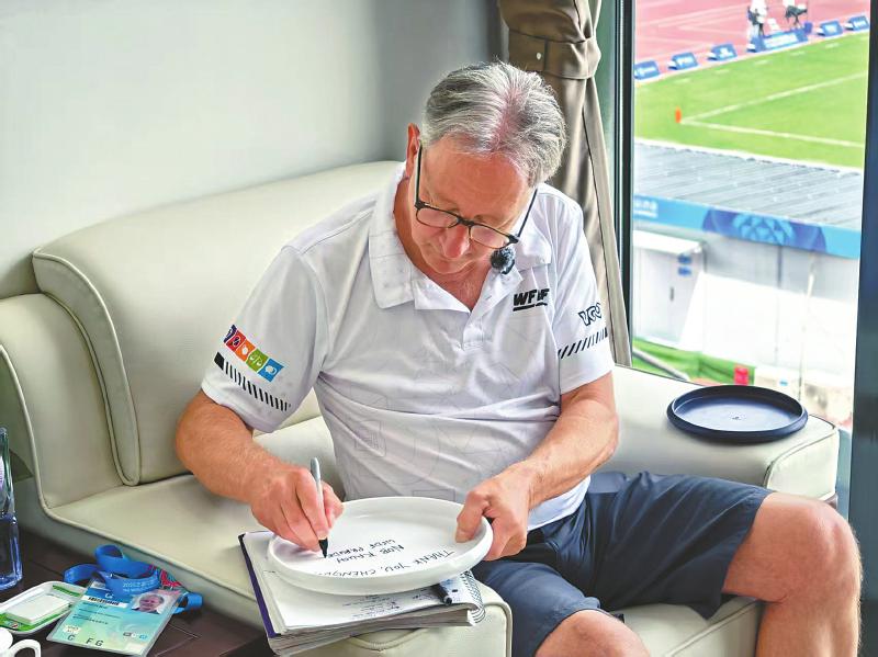 世界飞盘联合会主席罗伯特·劳赫在飞盘上写下感言。成都东部新区管委会供图