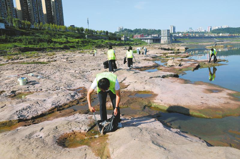 为迎接第三个全国生态日,广安市广安区中桥街道白塔社区联合当地多部门开展“守护绿水青山 共建美丽家园”主题实践活动。图为8月14日,环保志愿者在渠江白塔社区段河滩地清理垃圾。 廖小兵 摄(C视觉)