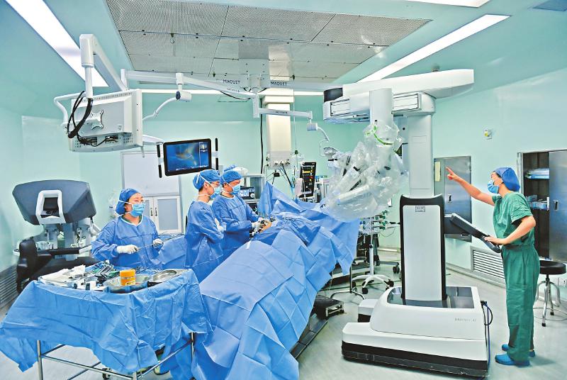 省人民医院机器人微创中心医生借助手术机器人进行手术。