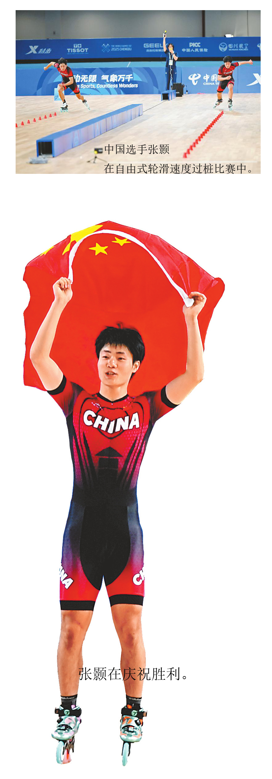 8月16日,成都世运会自由式轮滑速度过桩比赛在成都国际轮滑中心进行,中国队收获1金2银1铜。其中,男子组成都小伙张颢主场夺冠,付裕摘银;女子组朱思怡获银,温晶晶获铜。赛后,张颢直言“在家门口比赛更加紧张”。对于接下来花式绕桩比赛的目标,他说:“享受过程,把结果交给时间。” 四川日报全媒体记者 李志强 摄