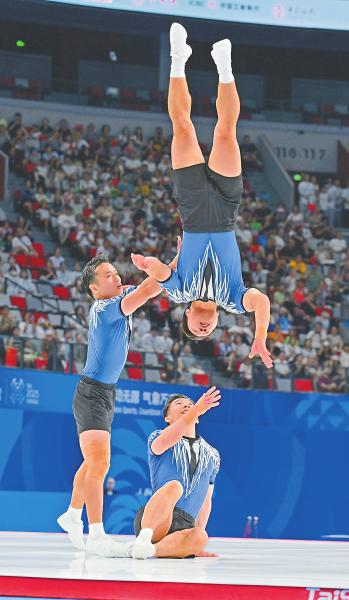 中国队在健美操三人操比赛中。 四川日报全媒体记者 欧阳杰 摄