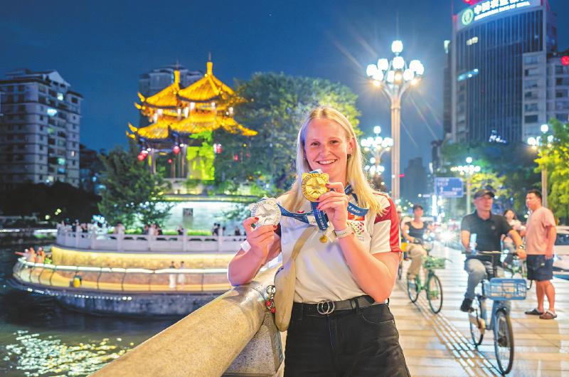 瑞士运动员埃琳娜在锦江边展示获得的奖牌。