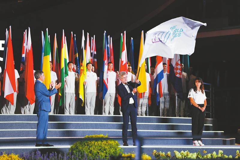 闭幕式上,国际世界运动会协会会旗交接仪式。 新华社发