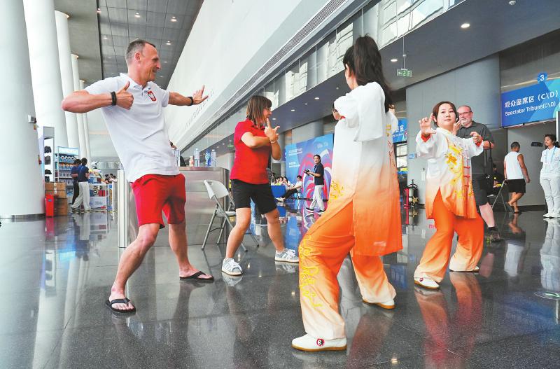 8月15日,简阳文体中心游泳馆里,外国友人在比赛间隙学起八段锦。
