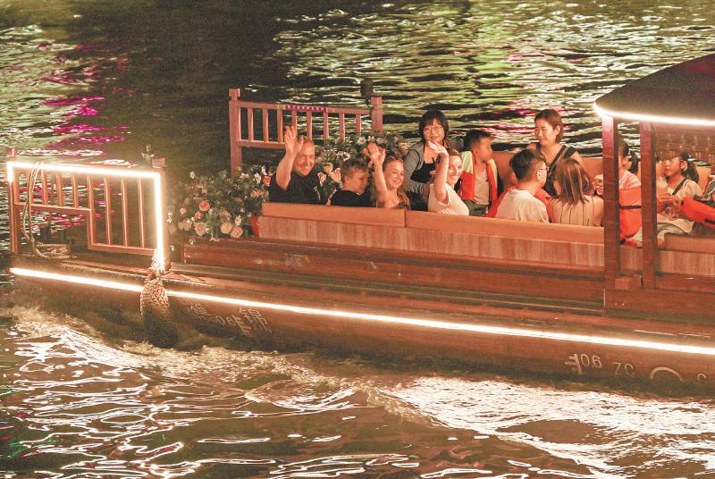 8月13日,美国队队员玛雅·利先科娃(前排右二)一家乘游船夜游锦江。