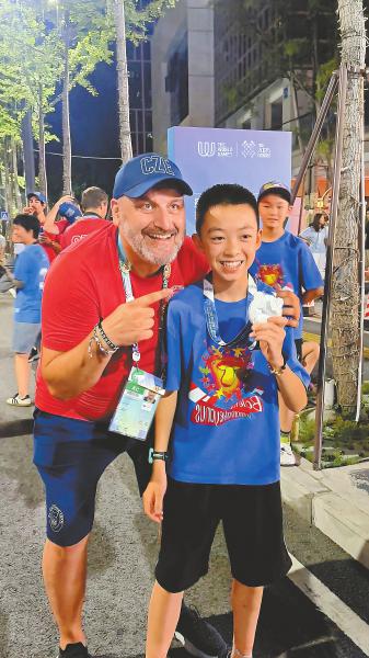8月11日,单排轮滑球男子决赛后,捷克队教练将银牌挂在中国小球迷胸前合影。