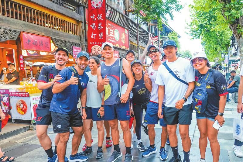 8月6日,参加成都世运会的外国运动员在成都宽窄巷子体验锦绣天府、安逸四川。