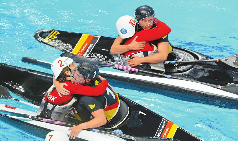 8月15日,皮艇球女子1/8决赛后,胜出的德国队队员与失利的丹麦队队员拥抱。