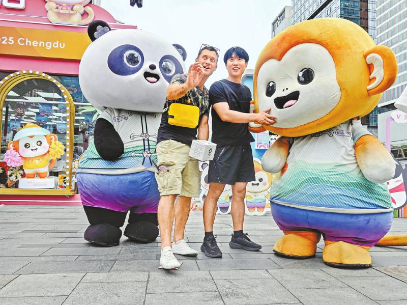 8月9日,外国游客在成都市红星路广场成都世运会官方特许商品零售店前打卡。