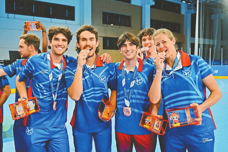 8月11日,单排轮滑球男子决赛在成都国际轮滑中心举行,纳米比亚队获得铜牌,队员们开心地分享夺牌的喜悦。