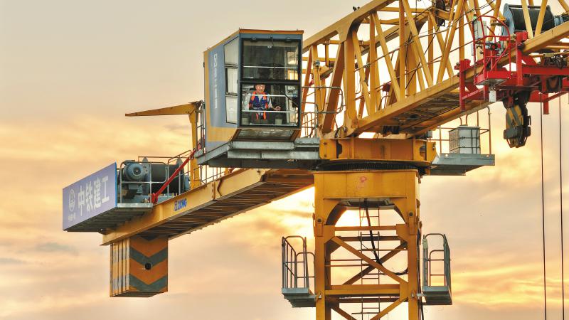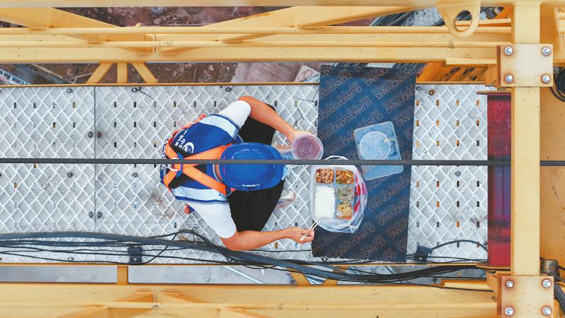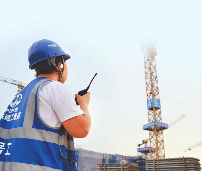 郭敏为高空中的杨廷光指引物料吊装作业。