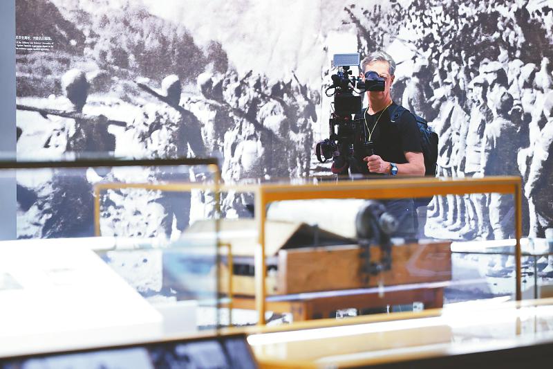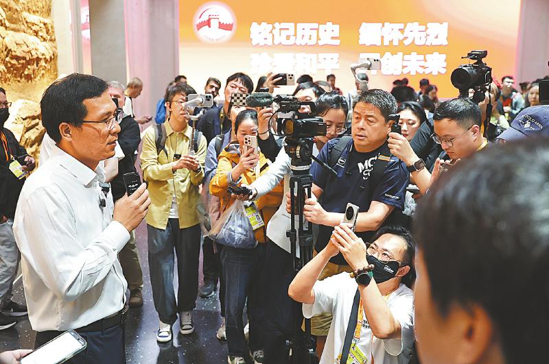 8月27日,中外媒体记者在中国人民抗日战争纪念馆内采访。