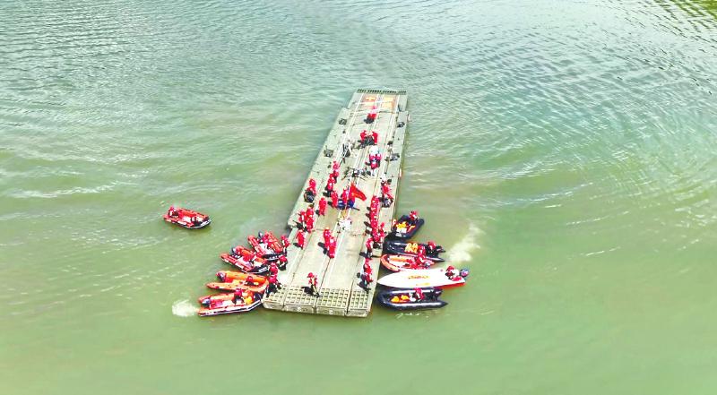 在“应急使命·2025”防灾减灾救灾新质战斗力实战检验性演习中,救援人员用动力舟桥转移物资。