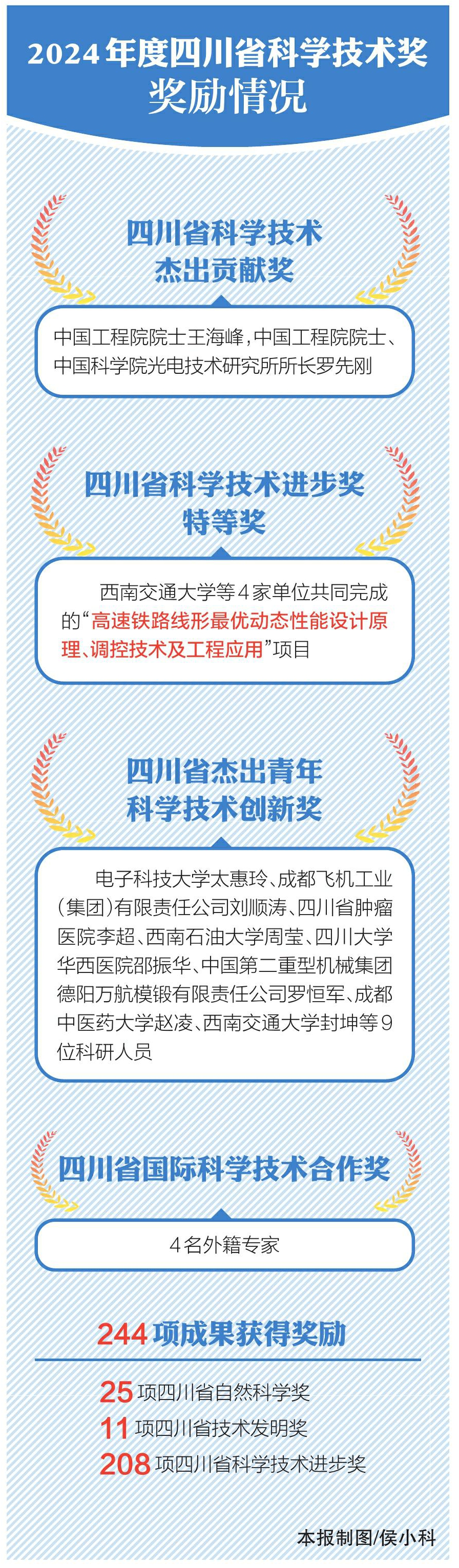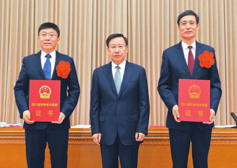 省委书记、省人大常委会主任王晓晖为二〇二四年度省科学技术杰出贡献奖获得者——中国工程院院士、航空工业成都飞机设计研究所型号总师王海峰和中国工程院院士、中国科学院光电技术研究所所长罗先刚颁奖。四川日报全媒体记者欧阳杰摄