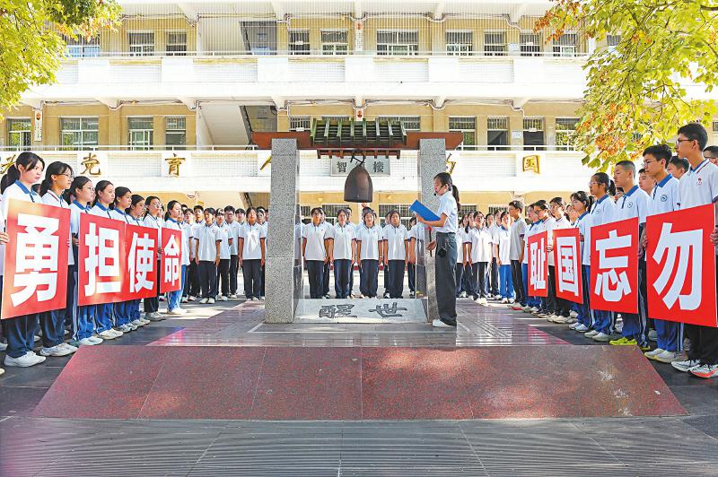 九月一日,南充市阆中中学老师在高一新生“开学第一课”上敲响“醒世钟”。抗战期间,日军曾四次空袭阆中,其中一颗未爆的炸弹弹壳被改造成三口“校钟”。王玉贵摄(C视觉)