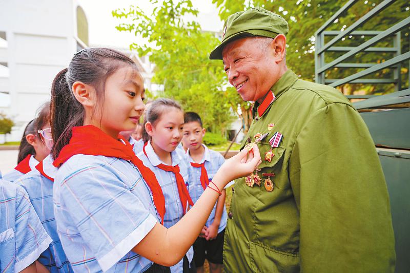 9月1日,在眉山市仁寿县文缜小学校的“开学第一课”上,一名学生在端详佩戴在老军人胸前的勋章。 潘帅 摄(C视觉)