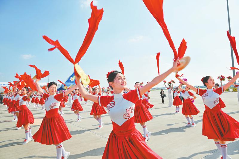 8月31日,工作人员在天津滨海国际机场迎接参加峰会的嘉宾。 新华社记者 孙凡越 摄
