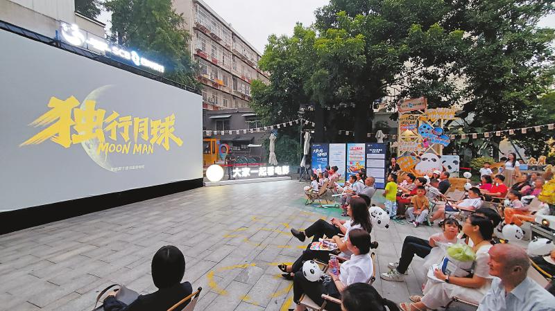 9月1日,在成都市武侯区玉东生活广场,市民正在观看电影《独行月球》。 四川日报全媒体记者 韦维 摄