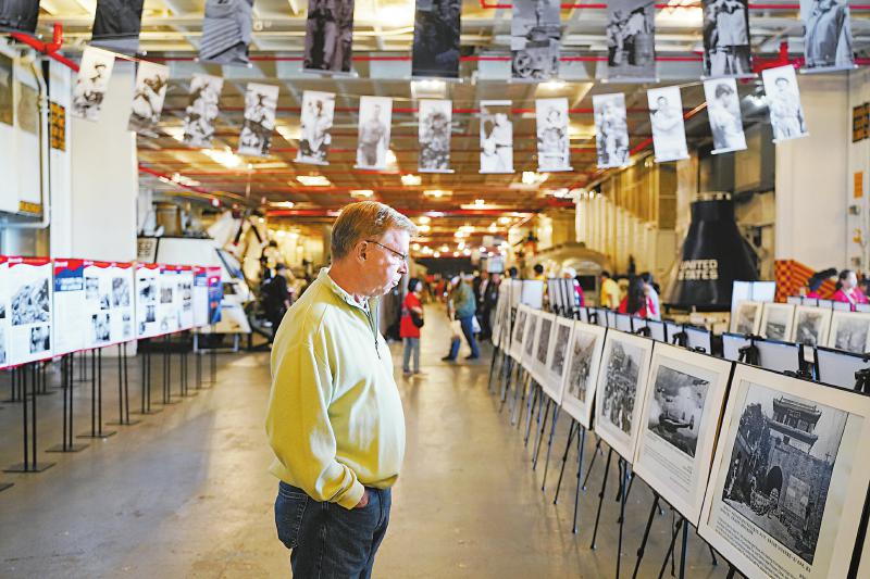图为当天的活动上,一名参观者观看抗战主题摄影展。新华社记者 吴晓凌 摄